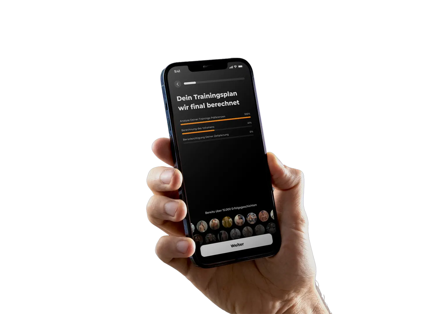 Du erhältst einen individuellen Trainingsplan, der sich an deine Ziele, deinen Alltag und deine Fortschritte anpasst. Mit präzisen Kalorienempfehlungen und integriertem Mahlzeiten-Tracking hast du alles an einem Ort, um deine Transformation nachhaltig und effizient zu erreichen.